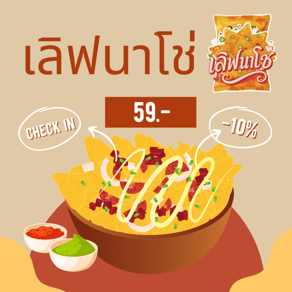 แค่เช็คอินที่ร้านและโพสต์ลงเฟสส่วนตัว พร้อมแท็ก @LoveNachos รับไปเลยส่วนลด 10% จากราคาปกติ 59 บาท!